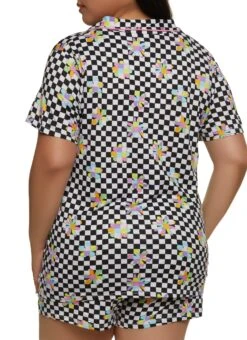 Plus Size Checkered Floral Print Pajama Shirt And Shorts