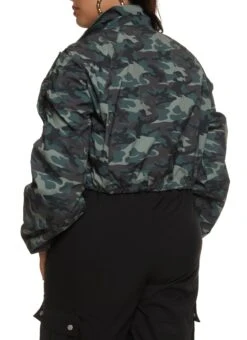 Plus Size Camo Ruched Sleeve Windbreaker Jacket