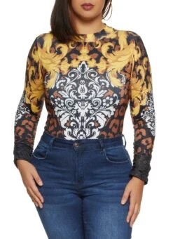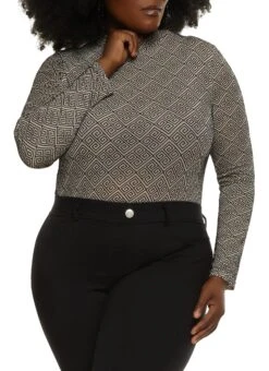 Plus Size Mesh Geometric Print Long Sleeve Bodysuit
