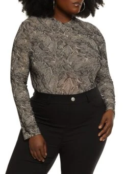 Plus Size Mesh Leaf Print Long Sleeve Bodysuit