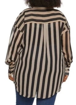 Plus Size Striped Smocked Cuff Button Front Blouse