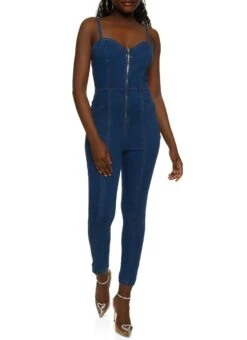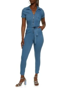 Denim Zip Up Tie Waist Belted Jumpsuit