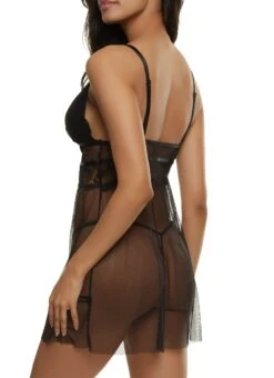 Black Patterned Lace Babydoll And G String