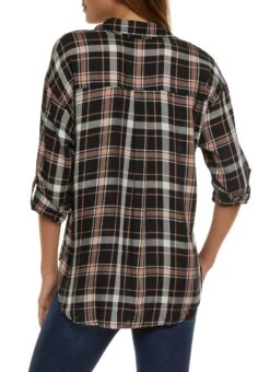 Ambiance Plaid Tabbed Sleeve Button Down Top