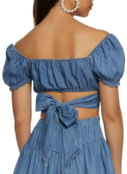 Chambray Puff Sleeve Tie Back Crop Top – LIGHT WASH