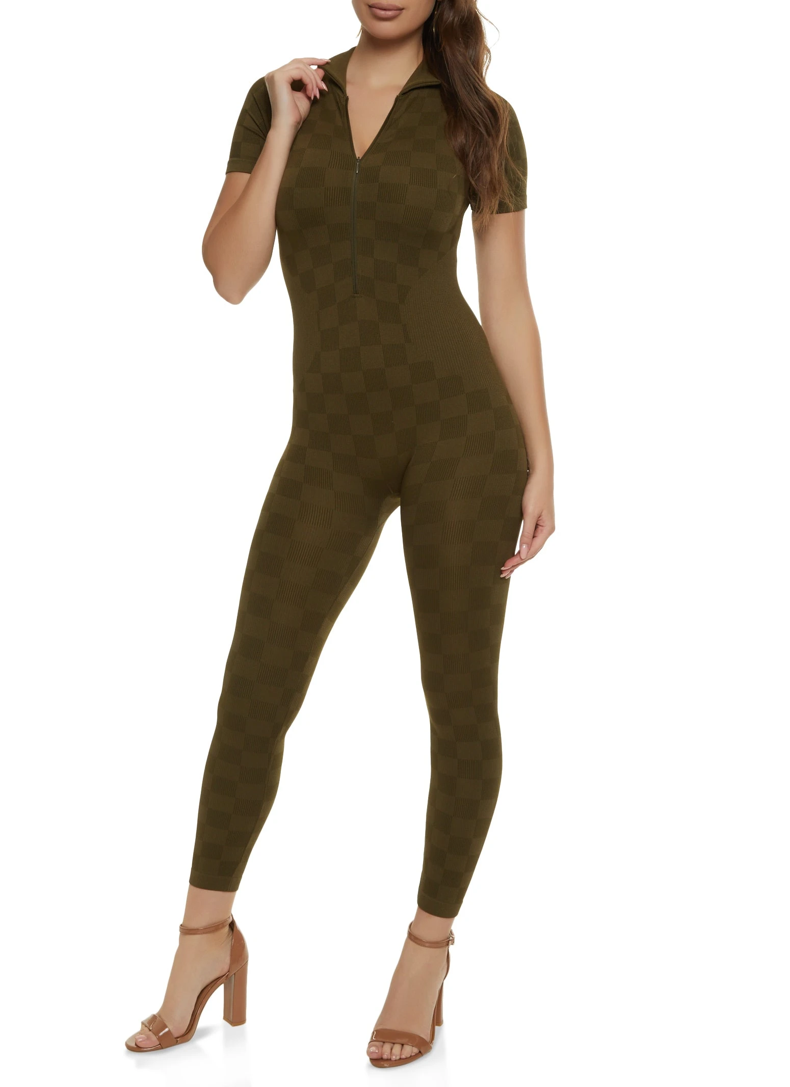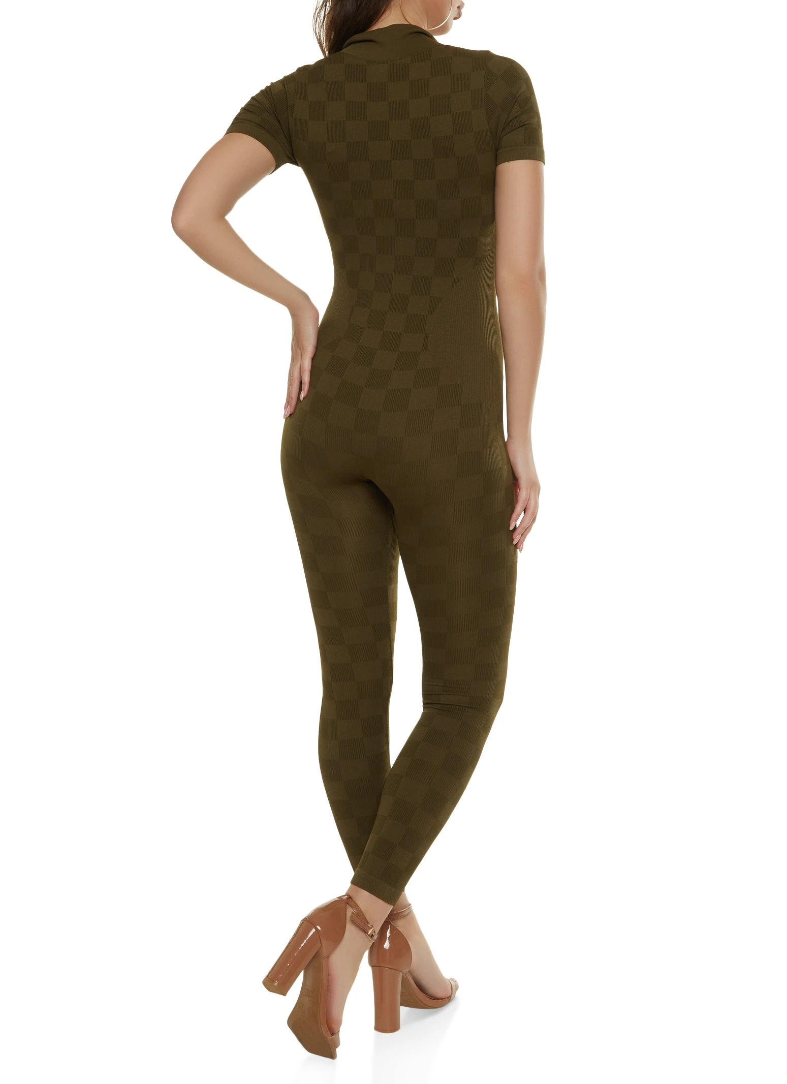 Checkered Seamless Zip Front Jumpsuit – OLIVE
