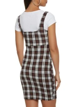 Crepe Knit Plaid Mini Dress with Ribbed Top – BLACK