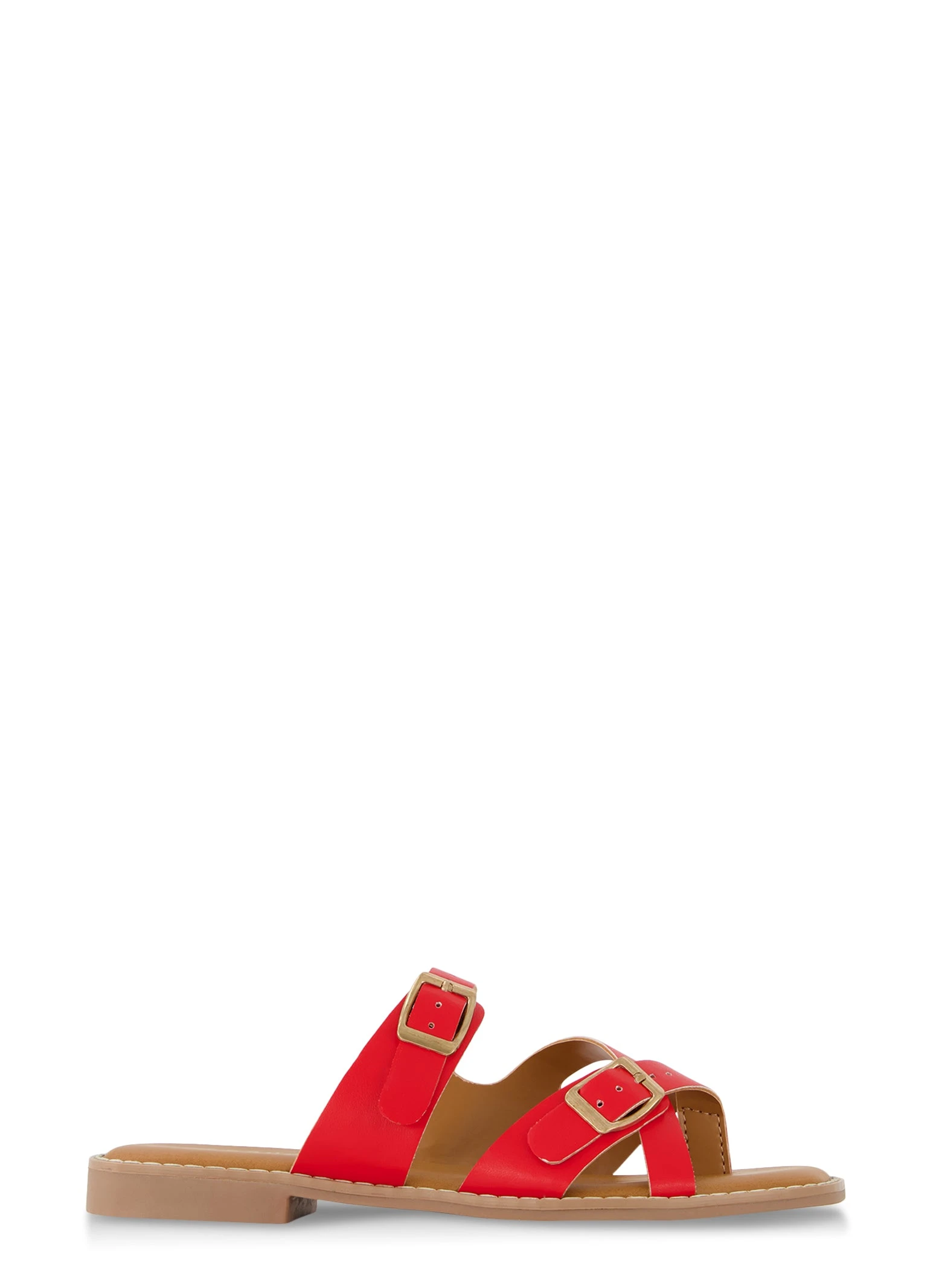 Criss Cross Double Buckle Detail Thong Sandals – RED