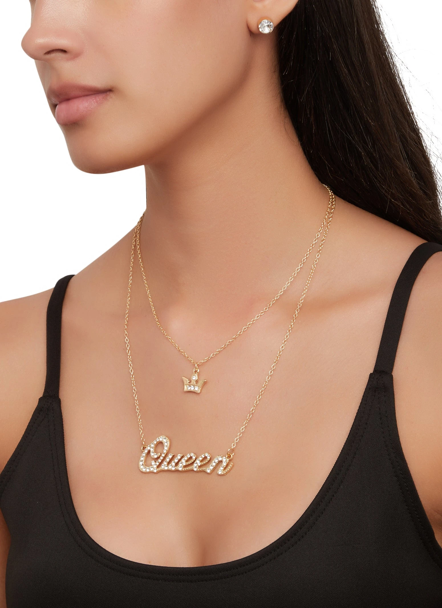 Crown Queen Rhinestone Layered Necklace and Stud Earrings – GOLD