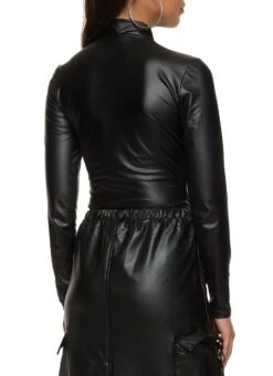 Faux Leather Half Zip Long Sleeve Bodysuit – BLACK