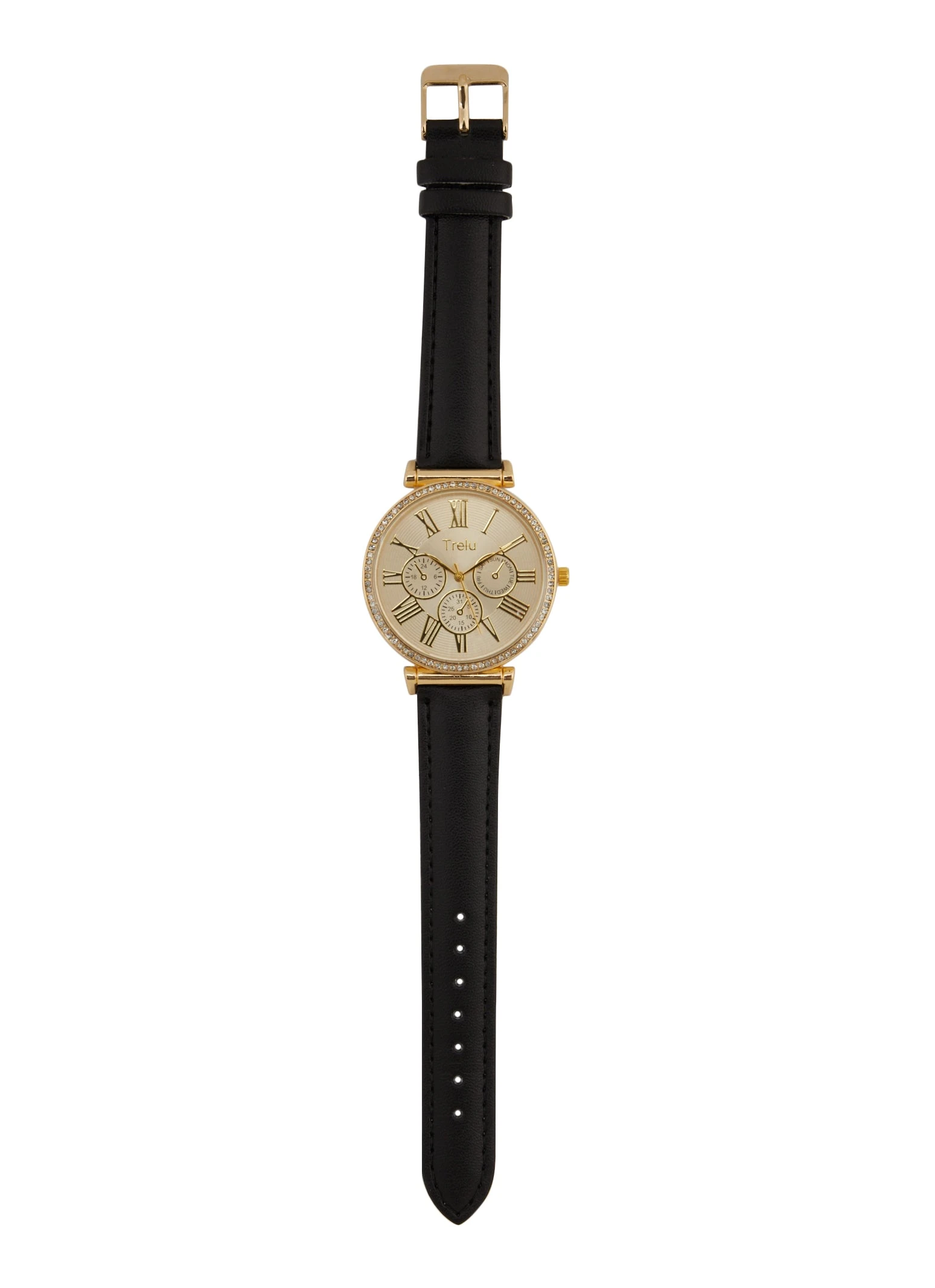 Faux Leather Rhinestone Trim Analog Watch – BLACK