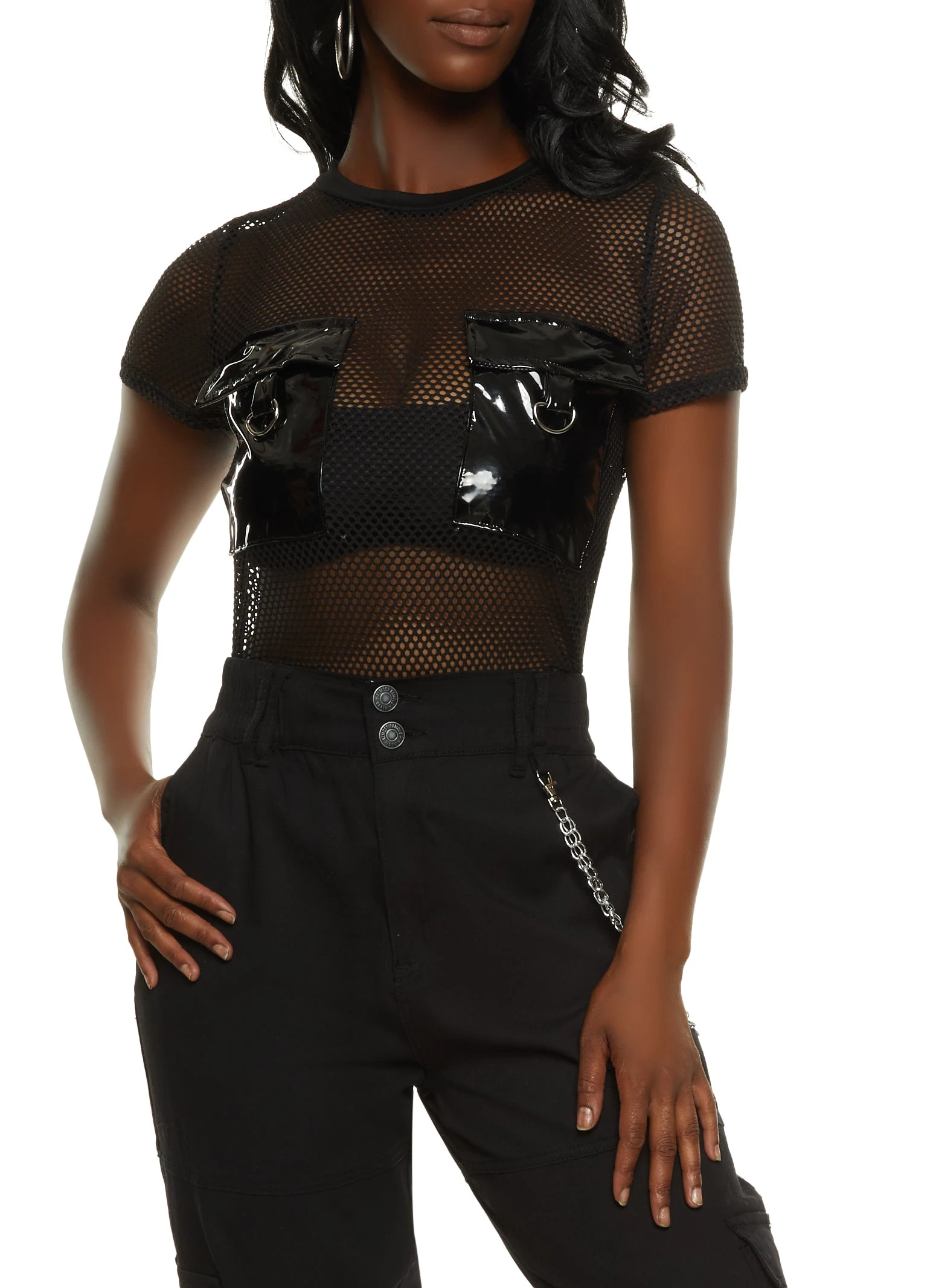 Fishnet Faux Leather Pocket Detail Bodysuit – BLACK