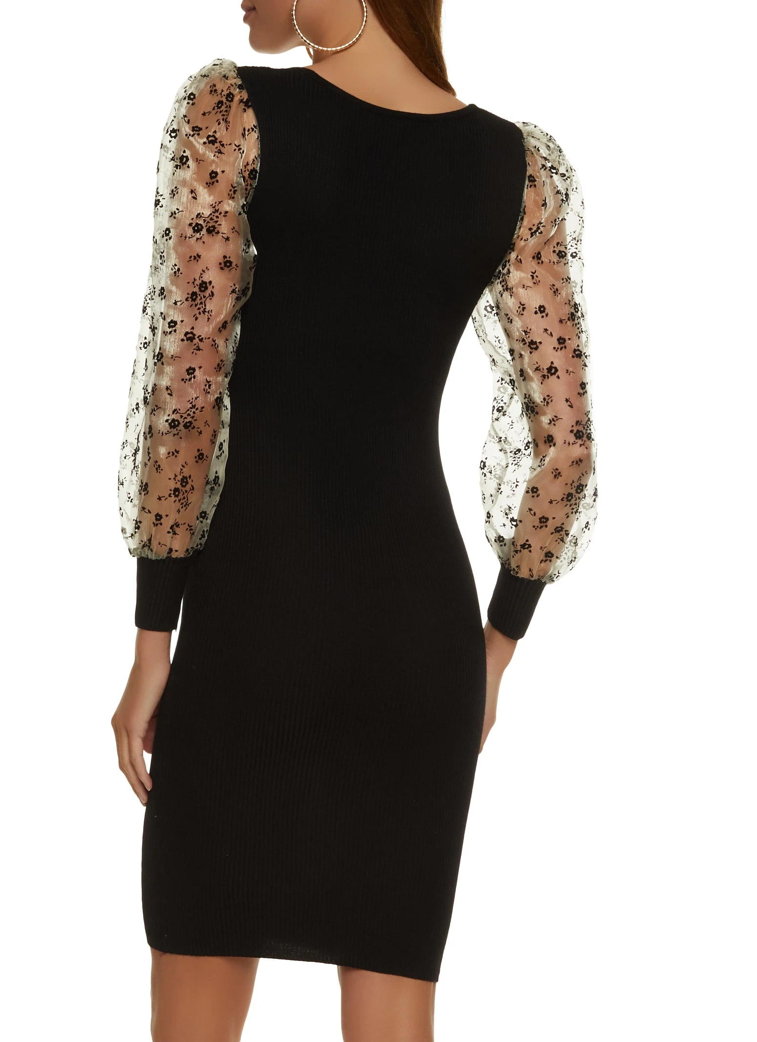 Floral Print Puff Sleeve Sweater Dress – BLACK