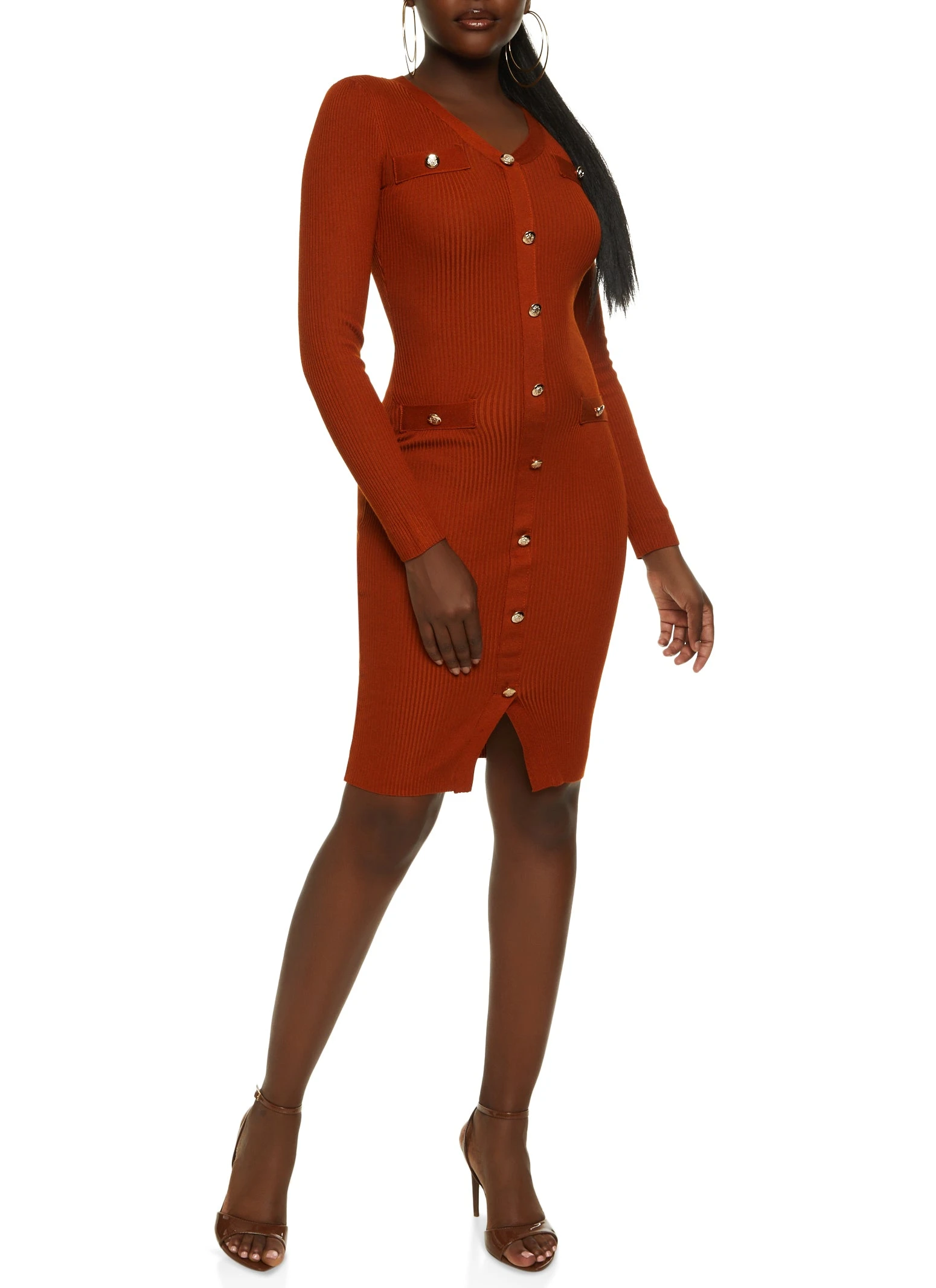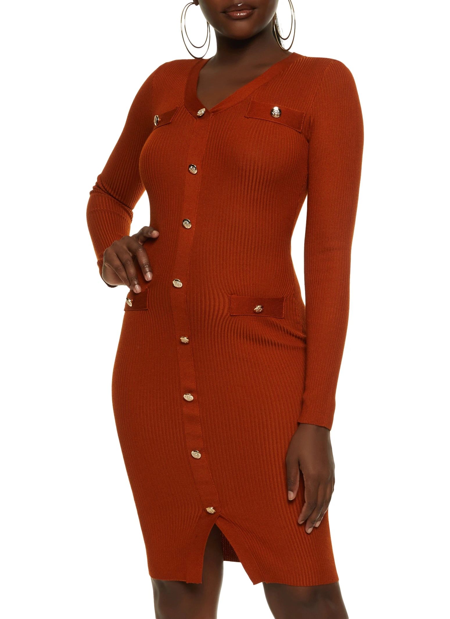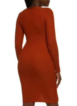 Long Sleeve Faux Button Front Midi Dress – RUST