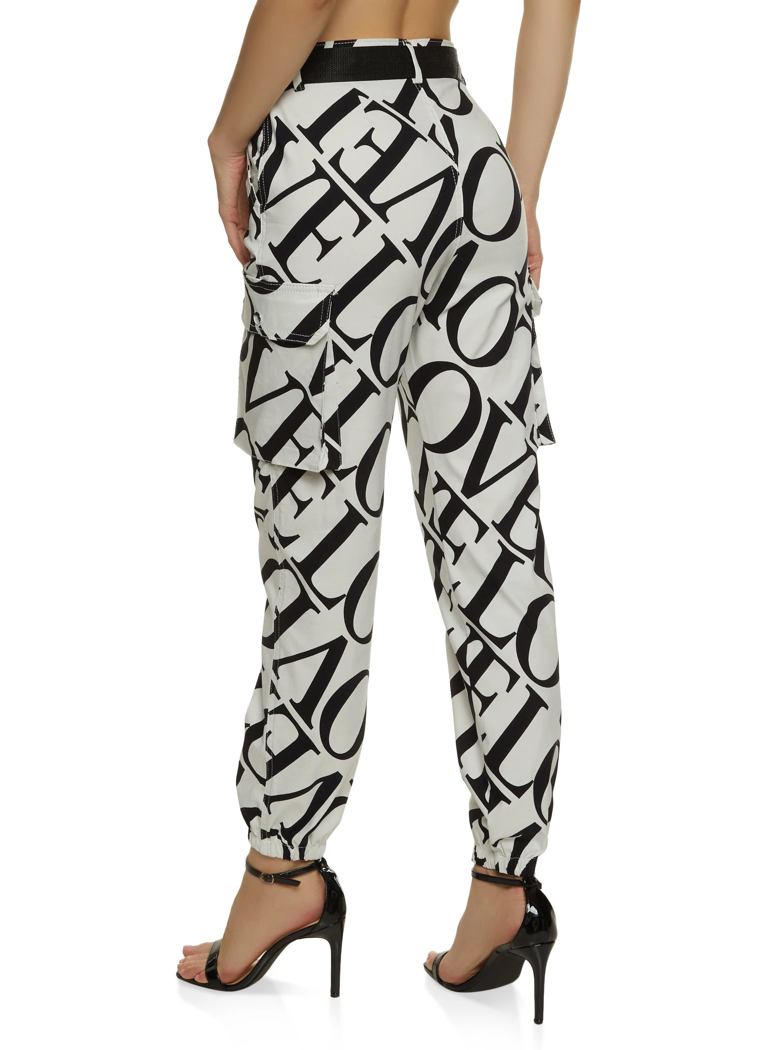 Mixed Print Belted Cargo Joggers – BLACK/WHITE