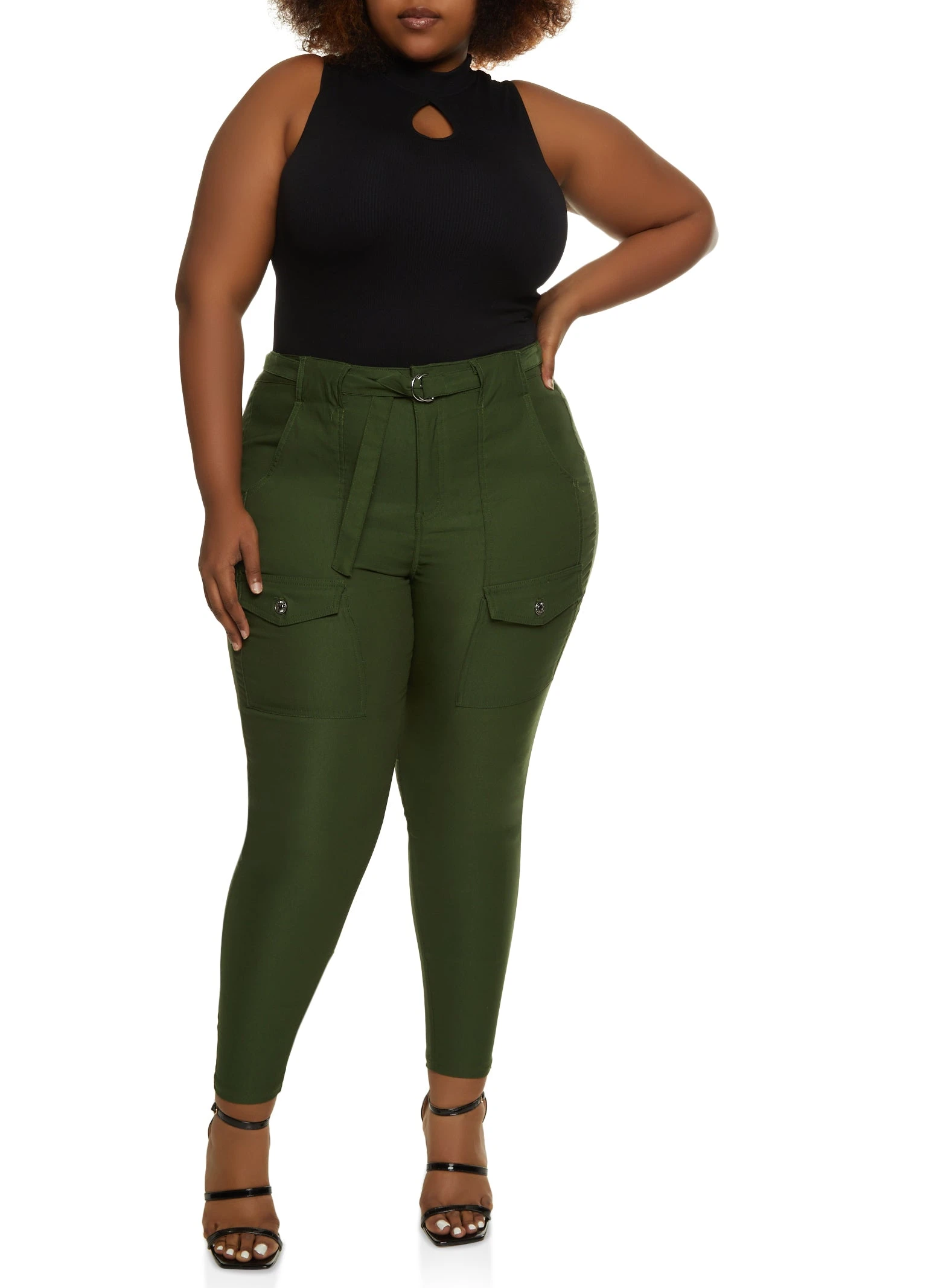 Plus Size Hyperstretch Belted Front Cargo Pocket Pants – OLIVE
