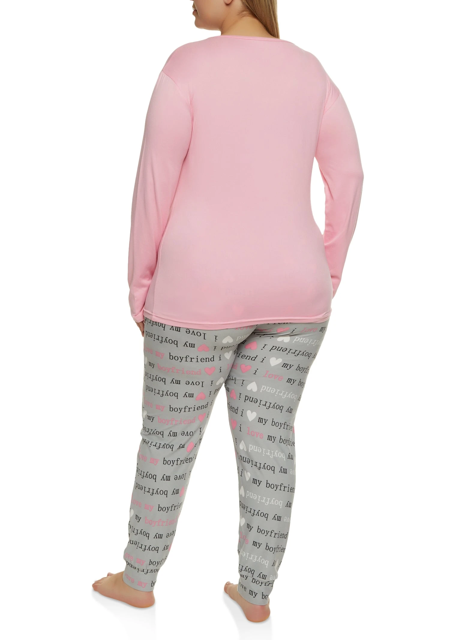 Plus Size I Love My Boyfriend Pajama Long Sleeve Top and Pants – PINK