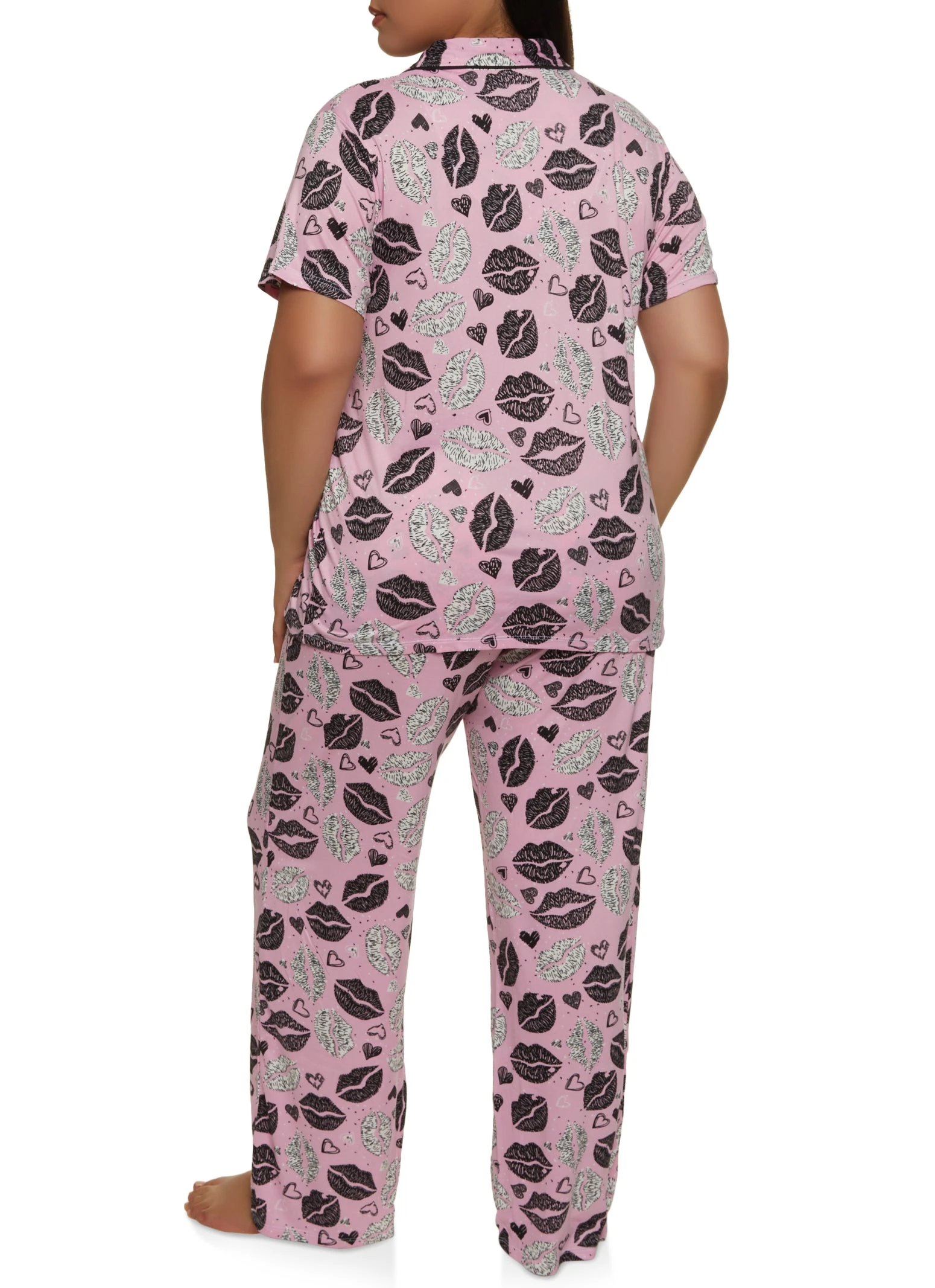Plus Size Lip Graphic Print Pajama Shirt and Pants – PINK