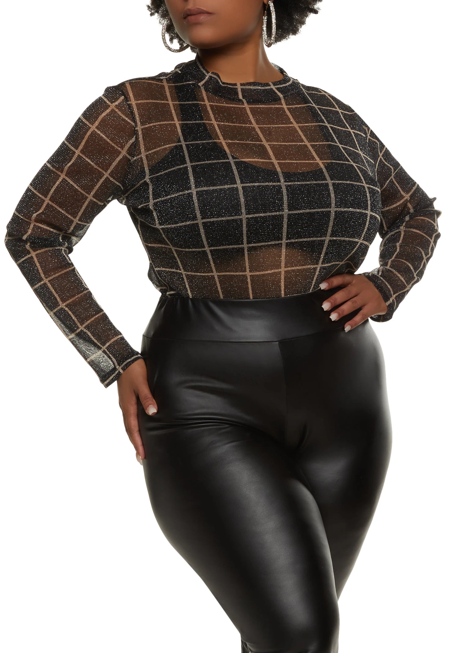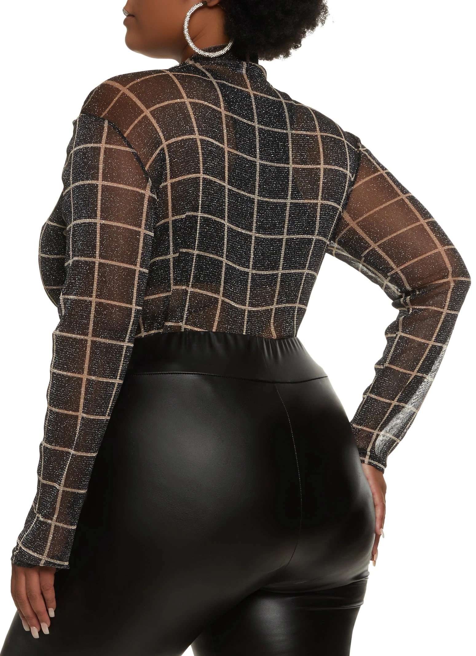 Plus Size Lurex Window Pane Patterned Long Sleeve Bodysuit – BLACK