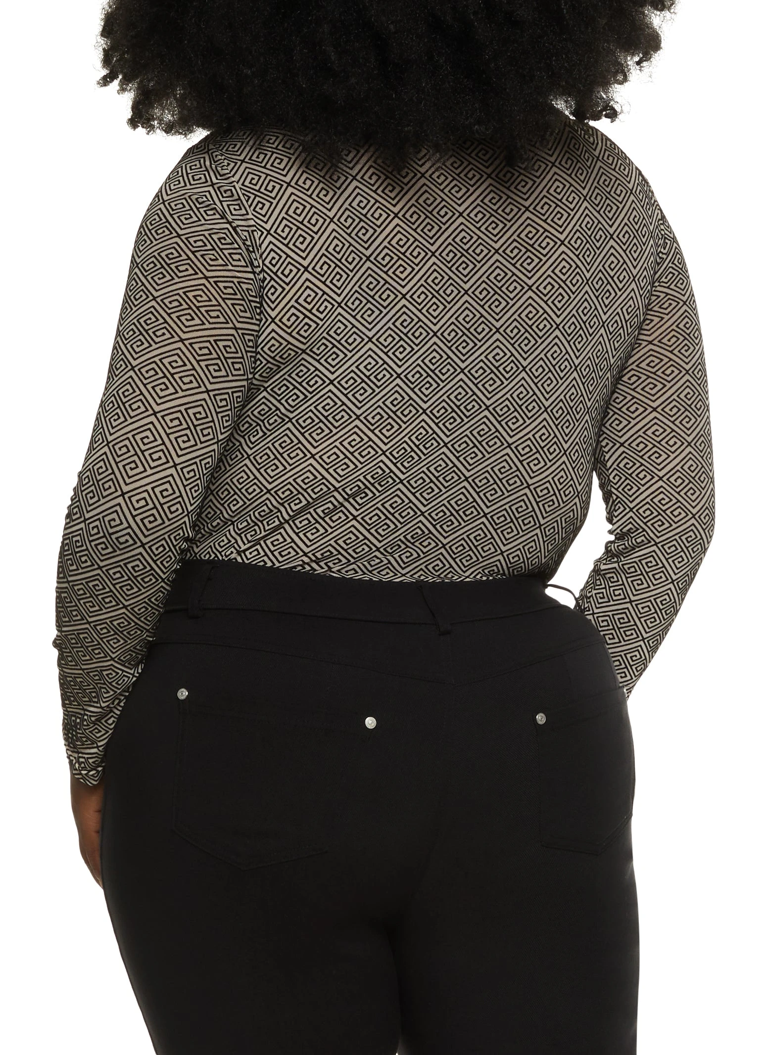 Plus Size Mesh Geometric Print Long Sleeve Bodysuit – SILVER