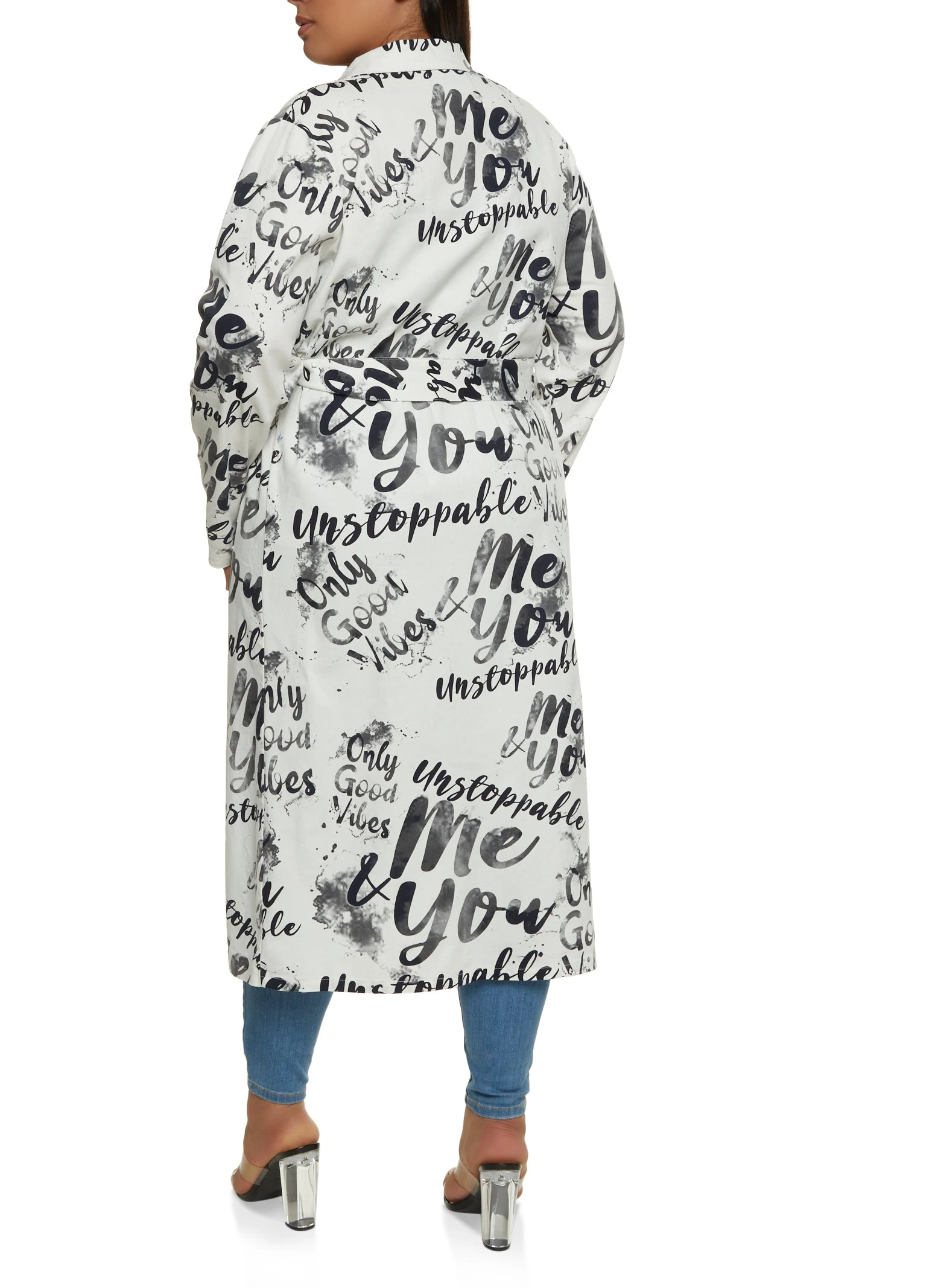 Plus Size Patterned Tie Waist Belted Long Jacket – WHITE