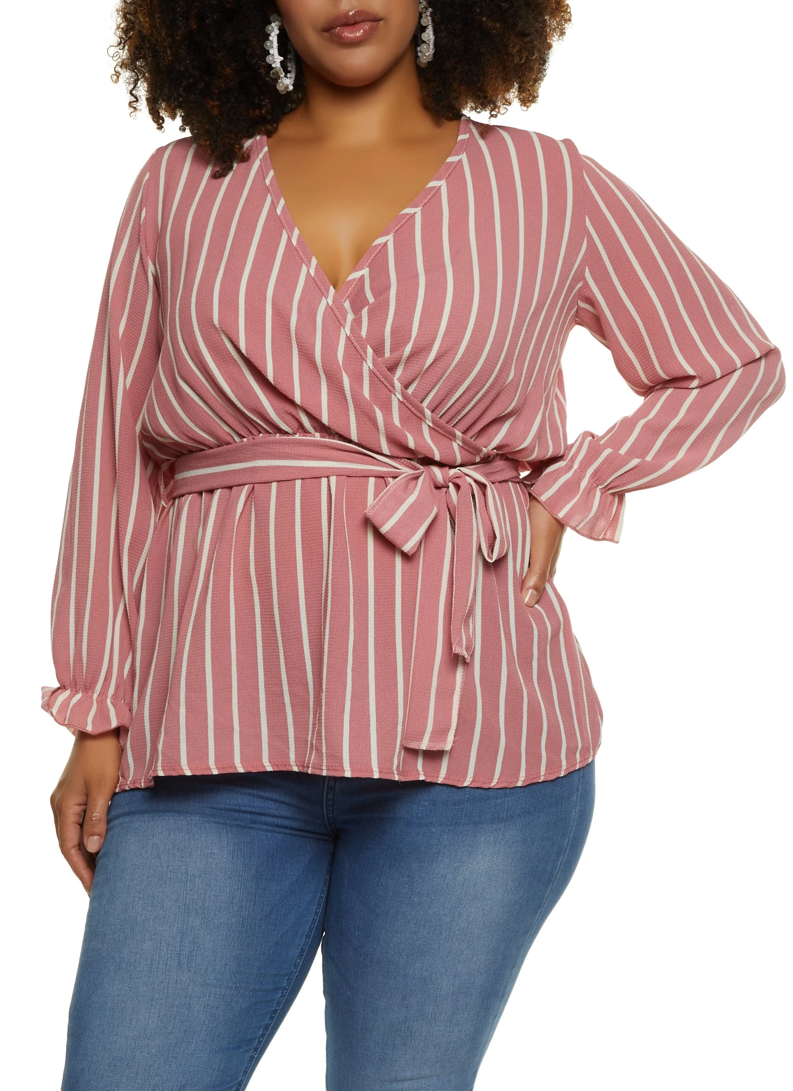 Plus Size Striped Tie Waist Belted Wrap Top – MAUVE
