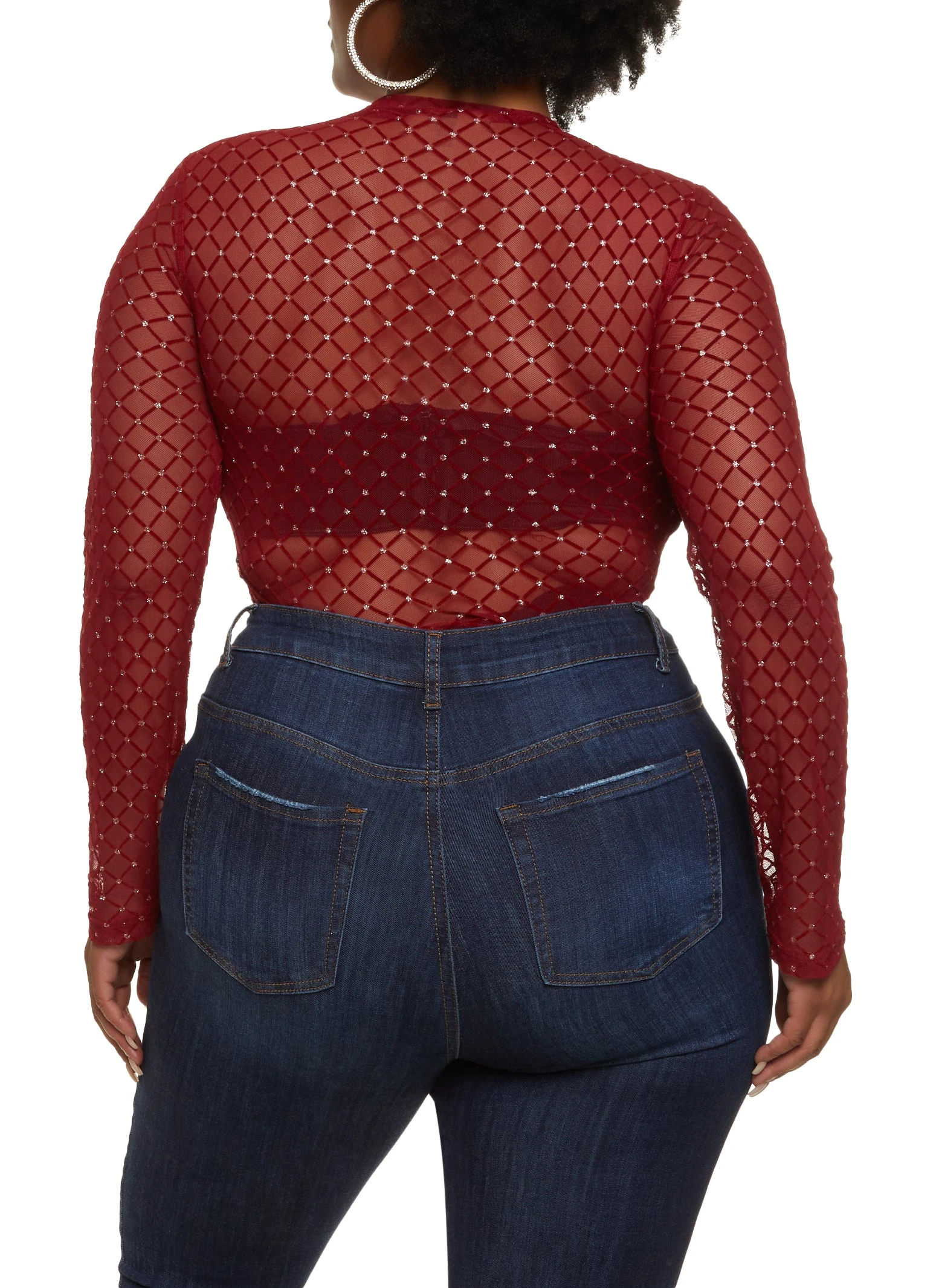 Plus Size Velvet Burnout Glitter Patterned Bodysuit – RED