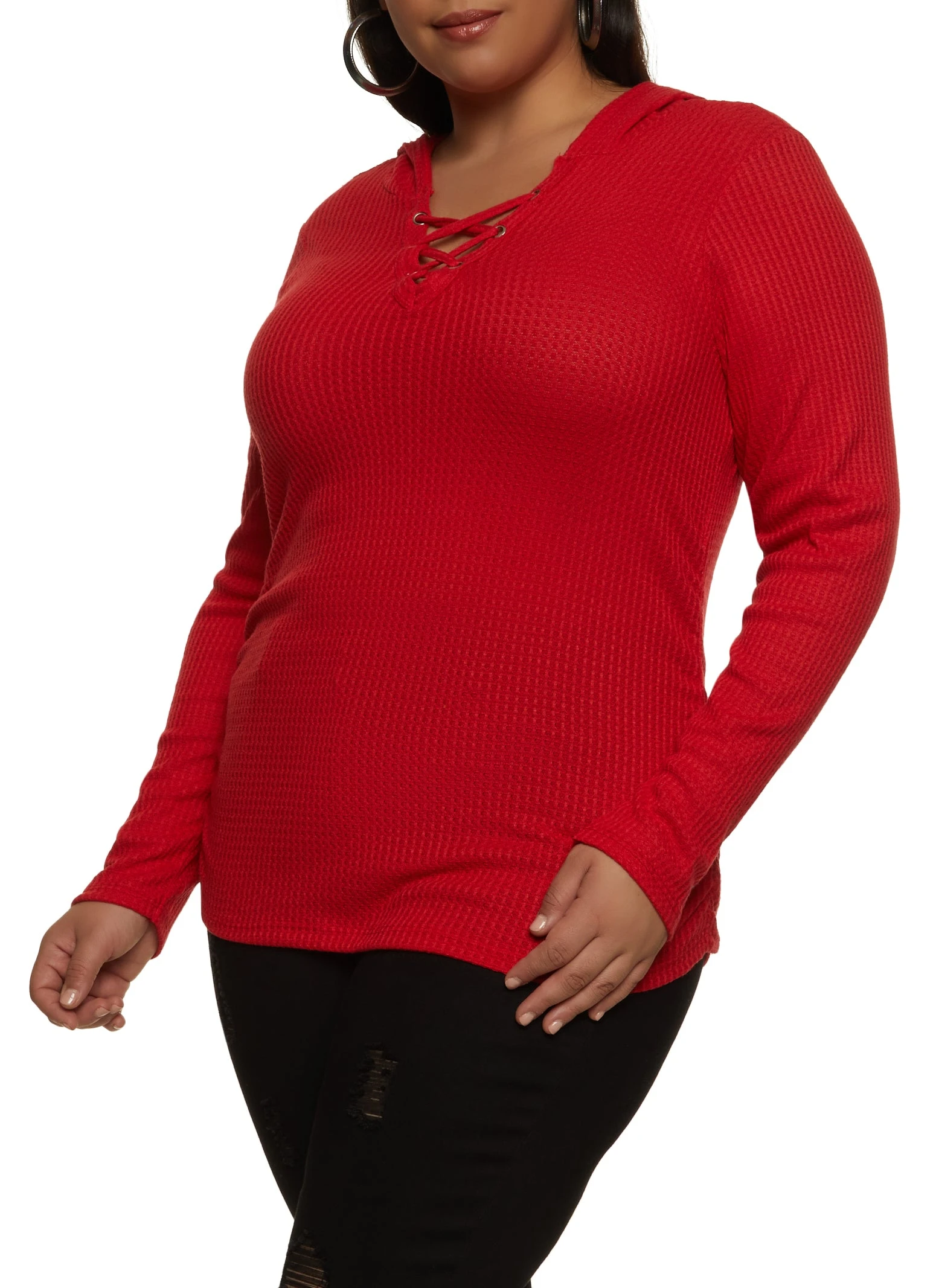 Plus Size Waffle Knit Lace Up Hooded Top – RED