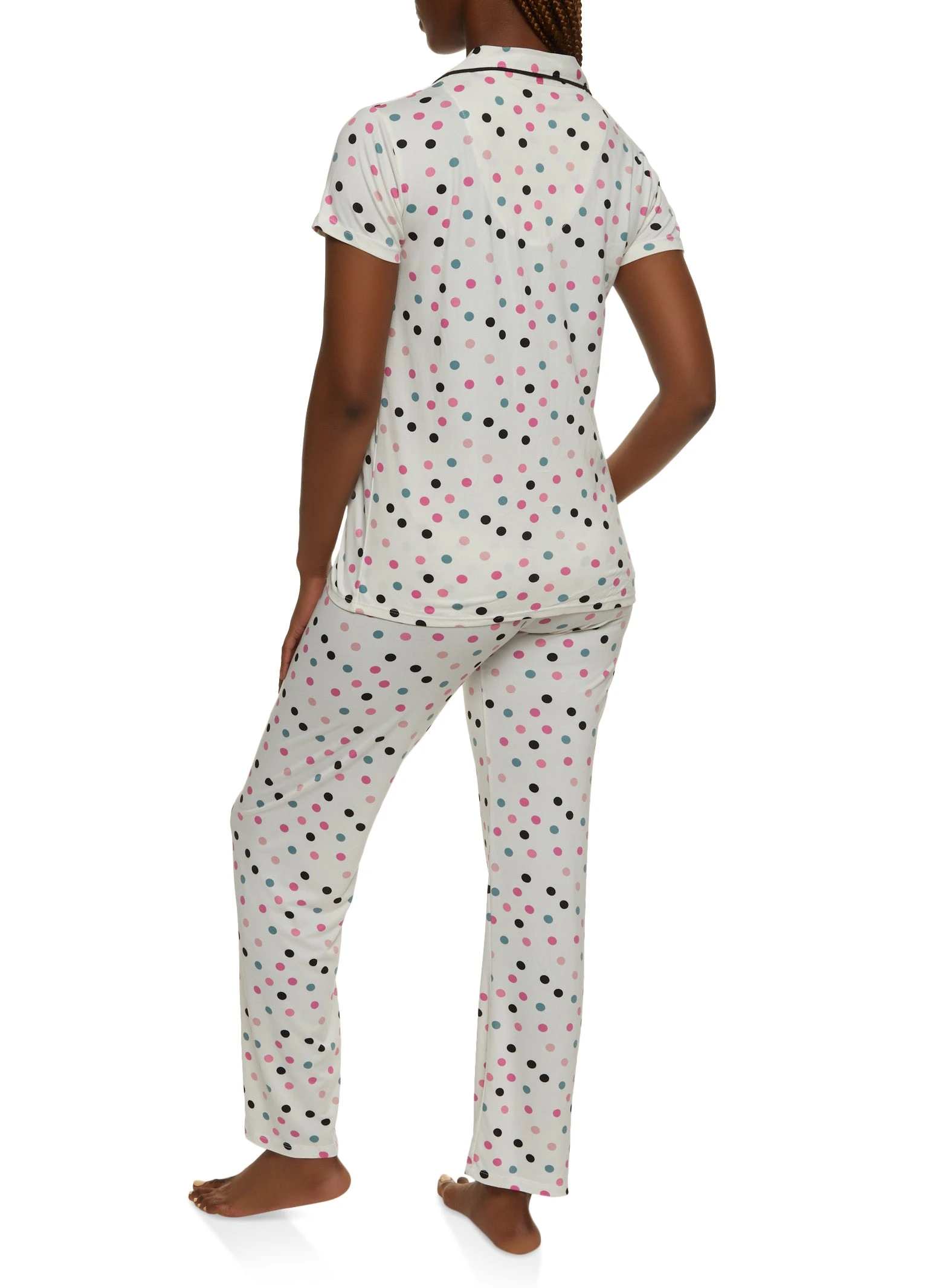 Polka Dot Patterned Notch Collar Pajama Shirt and Pants – PINK