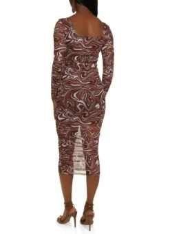 Psychedelic Print Mesh Ruched Midi Dress – BROWN