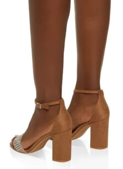 Rhinestone Band Ankle Strap Block Heel Sandals – TAN S