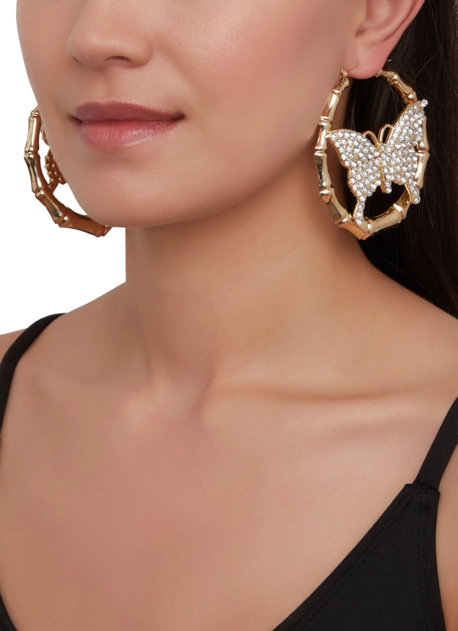 Rhinestone Butterfly Bamboo Hoop Earrings – GOLD