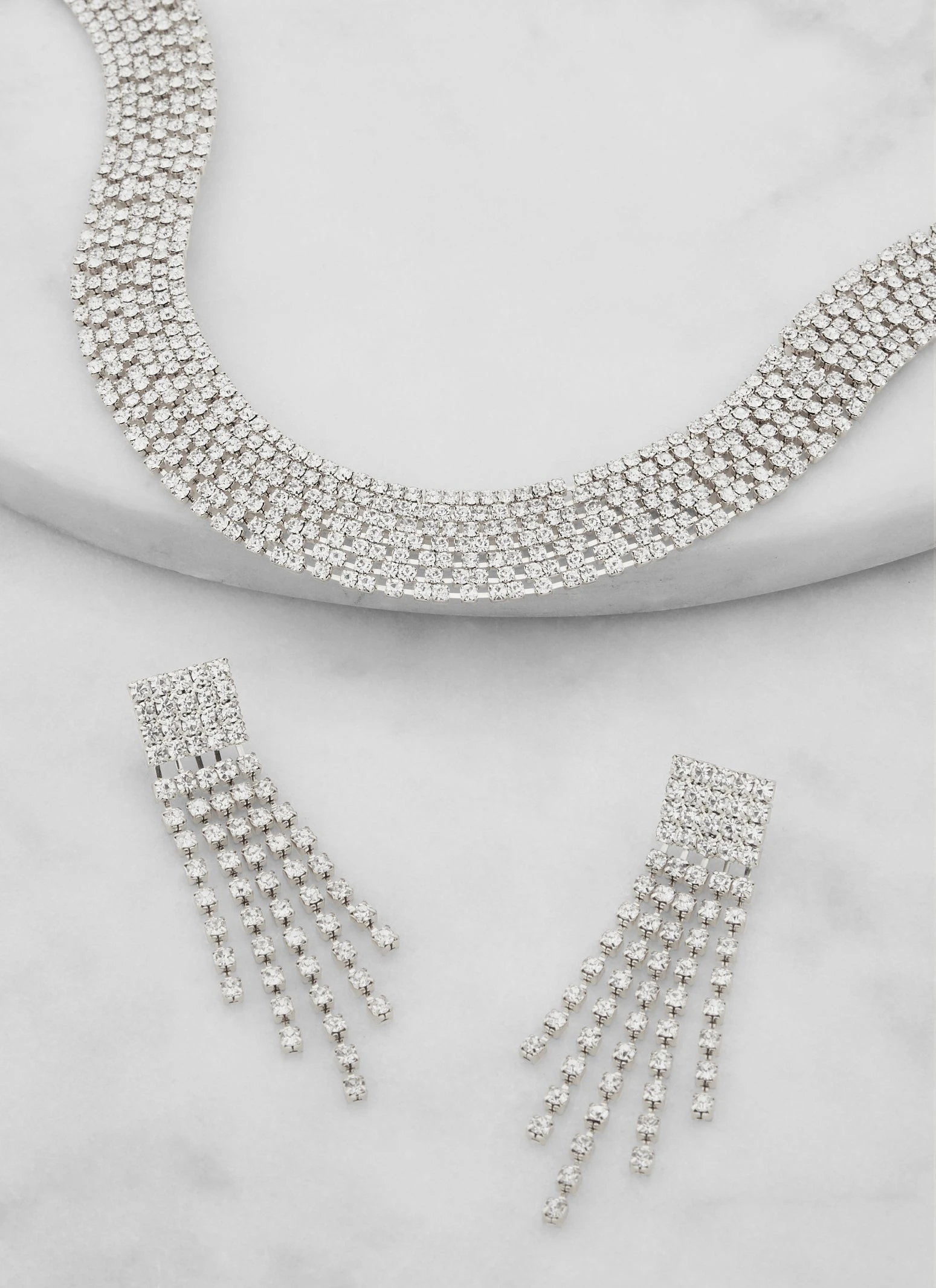 Rhinestone Choker Necklace and Fringe Tassel Earrings Set – SILVER
