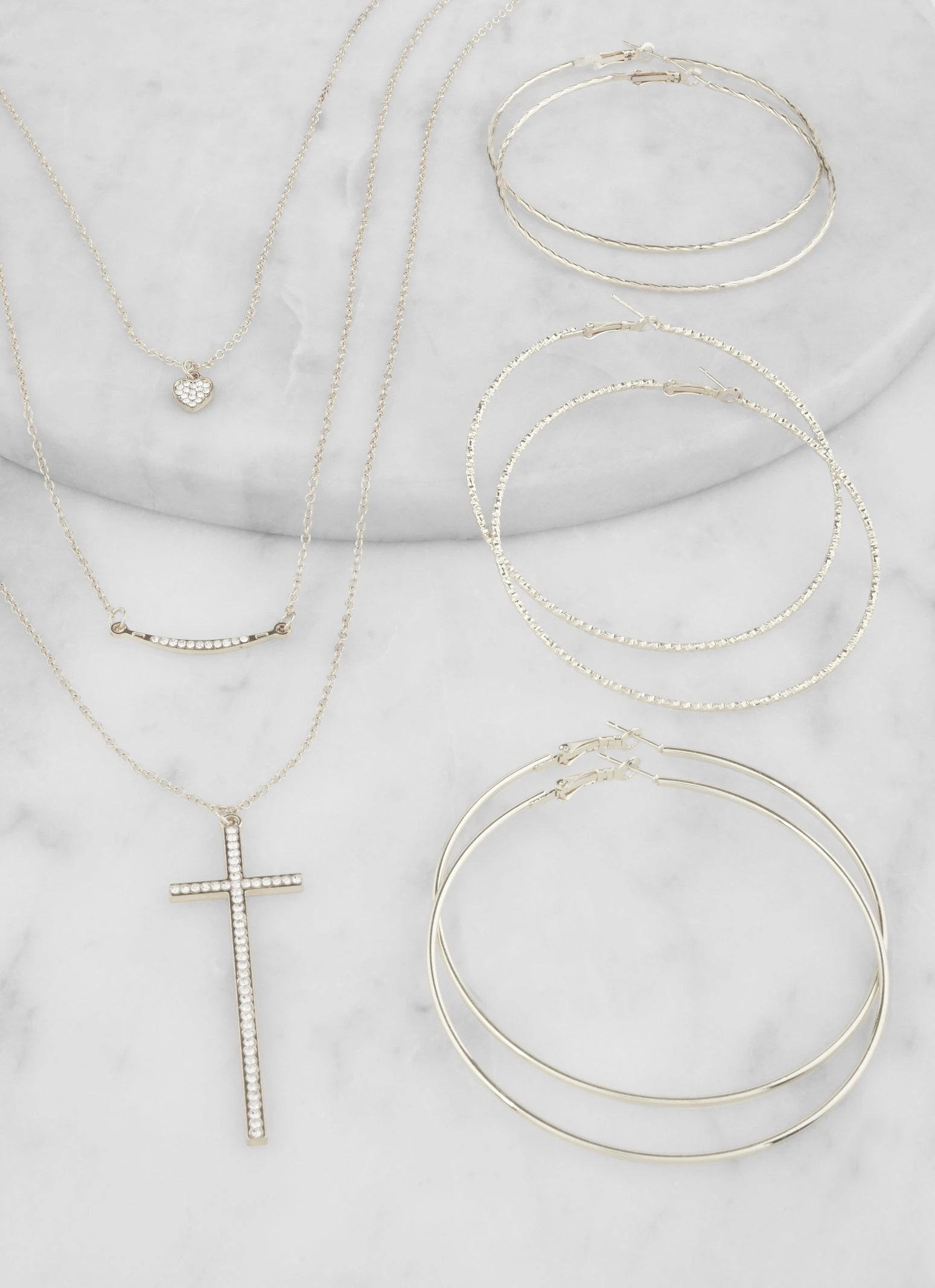 Rhinestone Cross Chain Layered Necklace and Hoop Earrings – SILVER