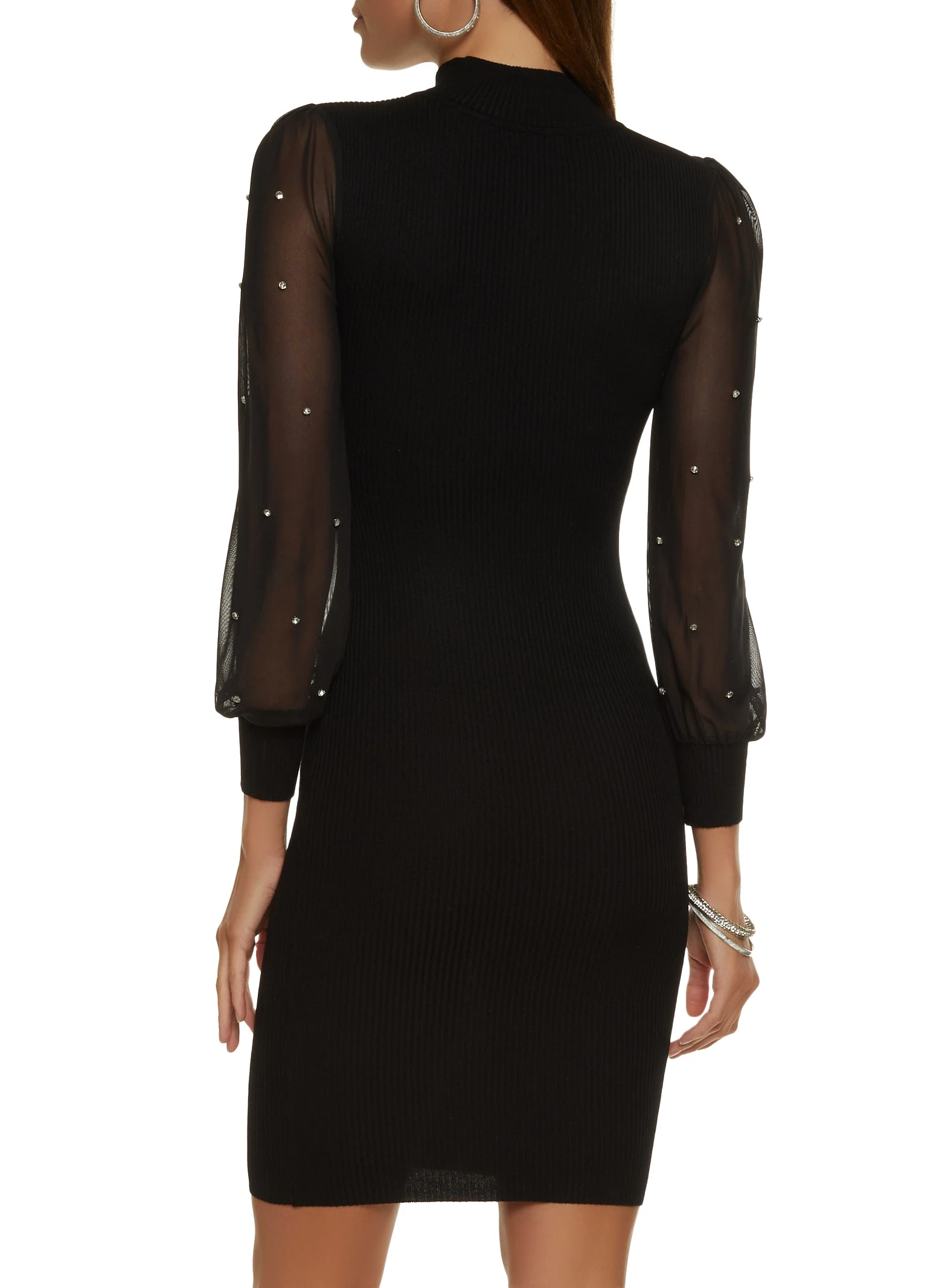 Rhinestone Studded Sleeve Mock Neck Mini Dress – BLACK