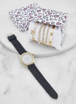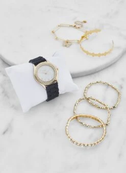 Rhinestone Trim Watch and Assorted Stretch Bracelets Set – BLACK