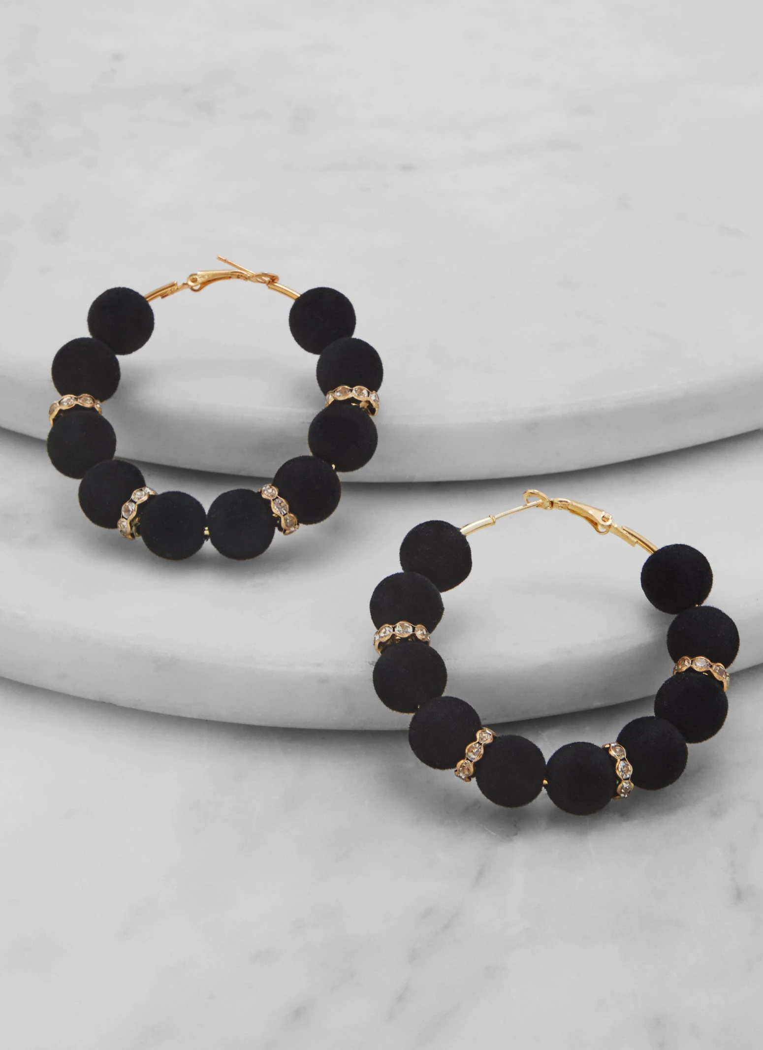 Rhinestone Velvet Beaded Hoop Earrings – BLACK