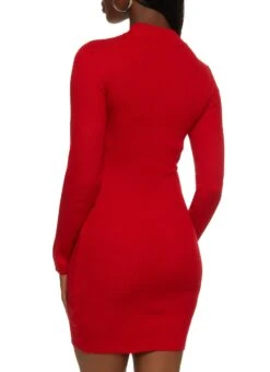 Ribbed Lace Up Detail Mock Neck Mini Dress – RED