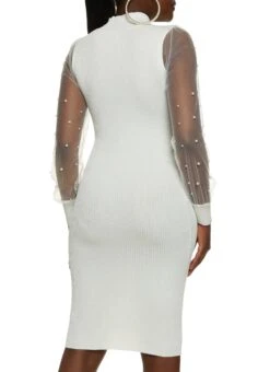 Ribbed Mock Neck Mesh Sleeve Mini Dress – WHITE