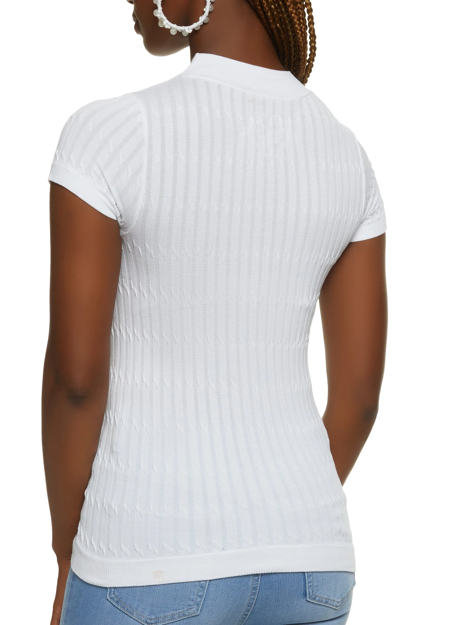 Seamless Cable Knit Mock Neck Short Sleeve Top – WHITE