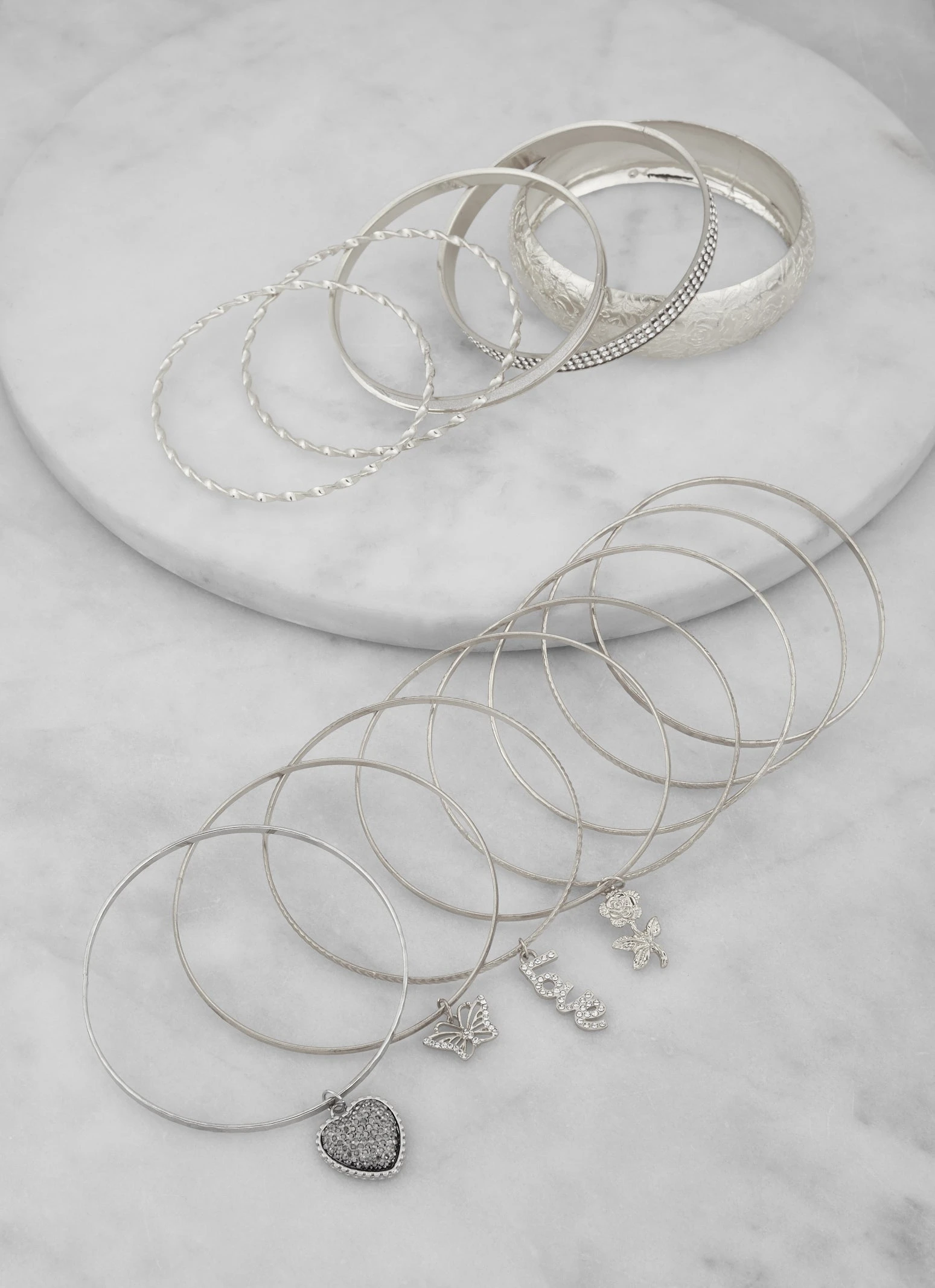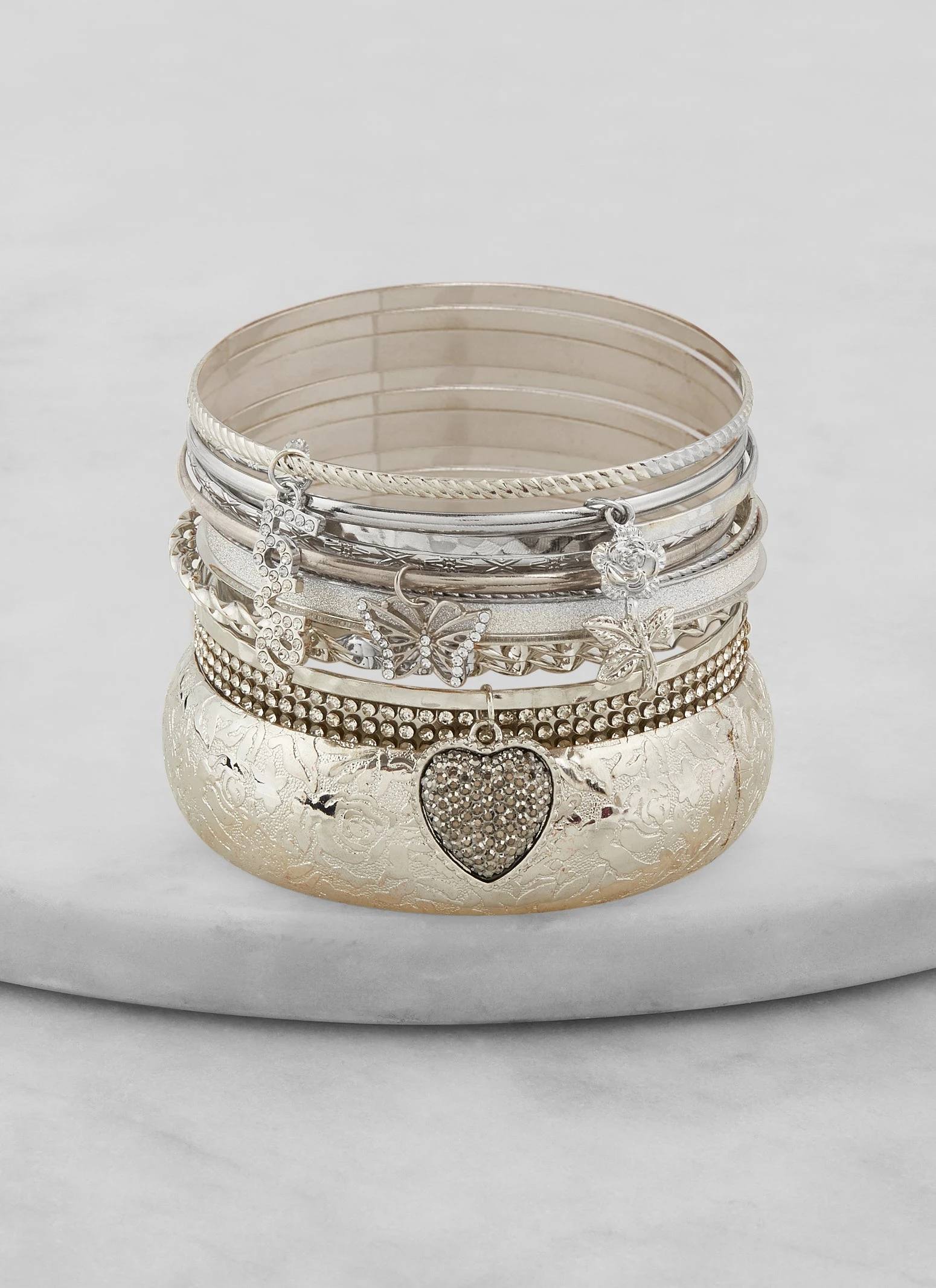 Set of 13 Rhinestone Charm Metallic Bangles – SILVER