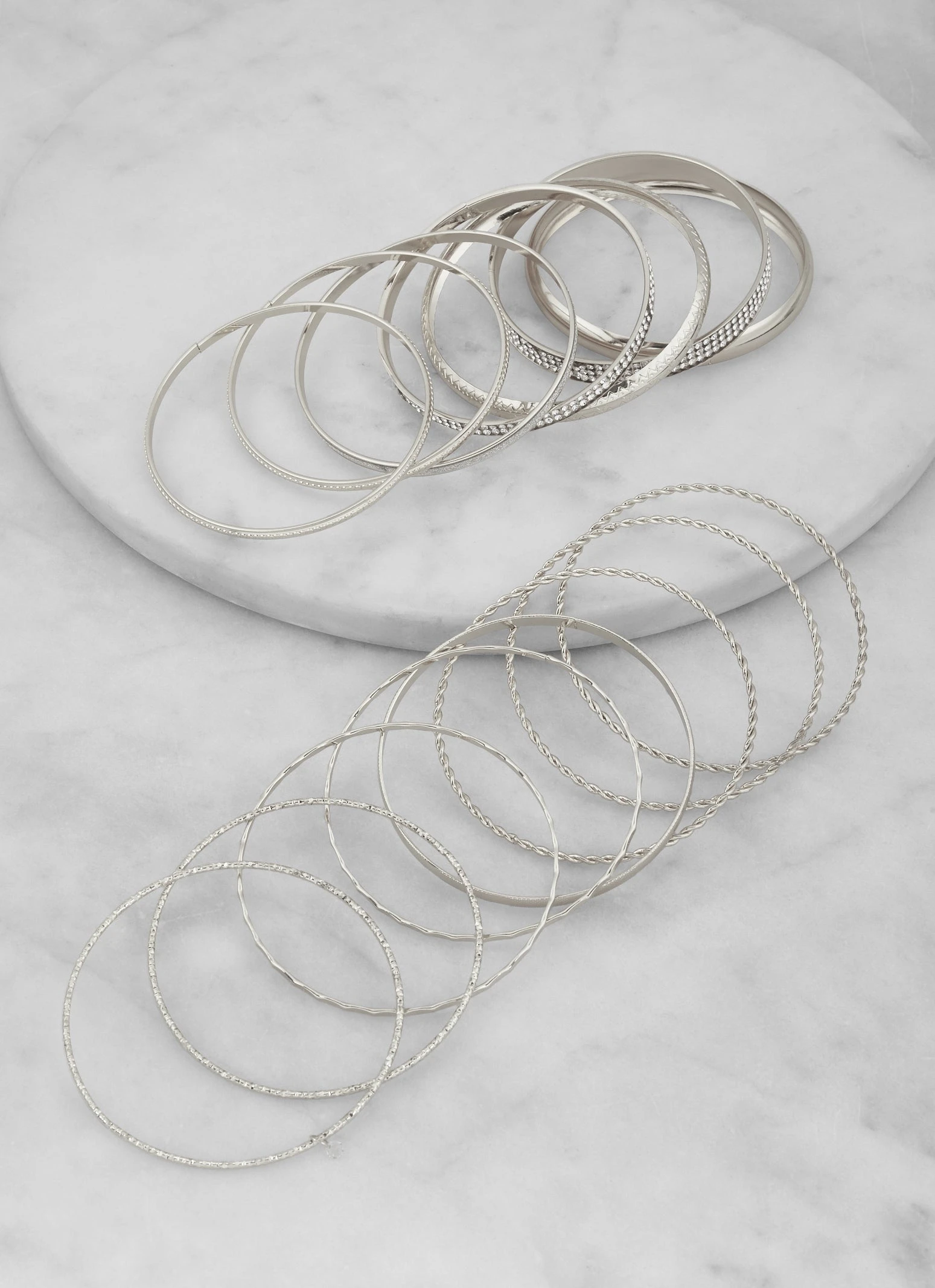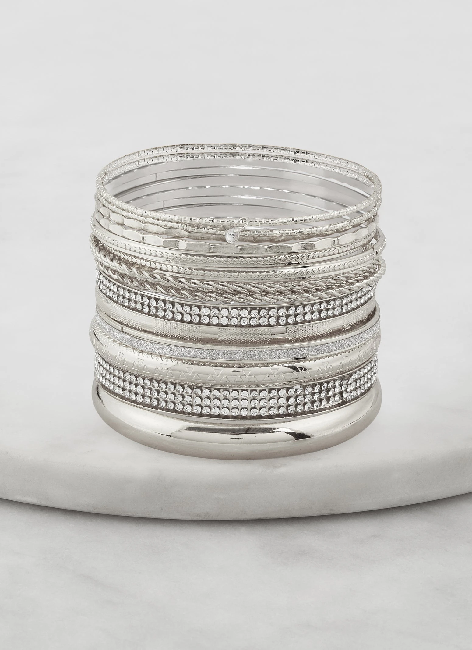 Set of 15 Rhinestone Metallic Textured Bangles – SILVER