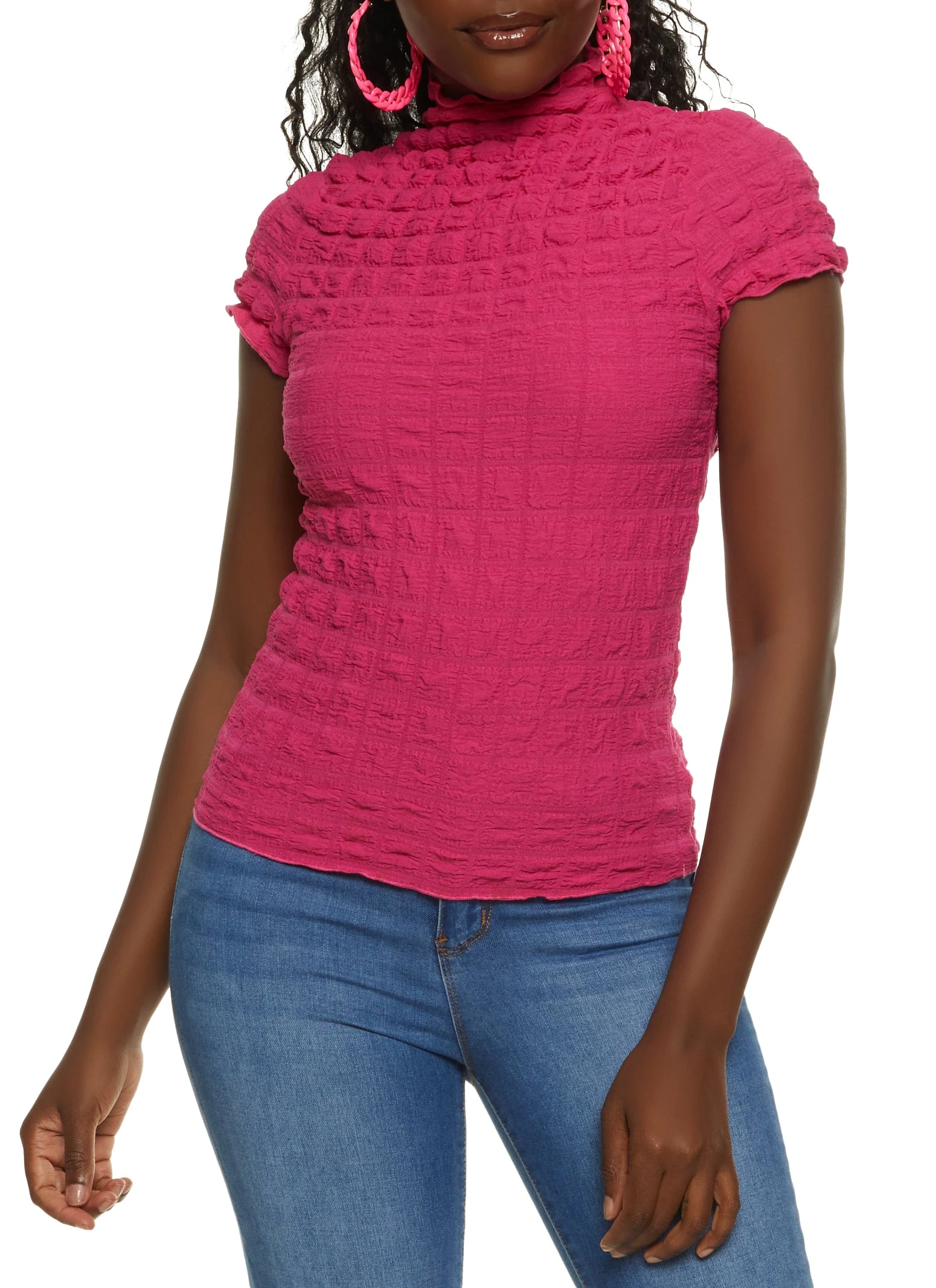 Solid Bubble Knit Mock Neck Top – FUCHSIA