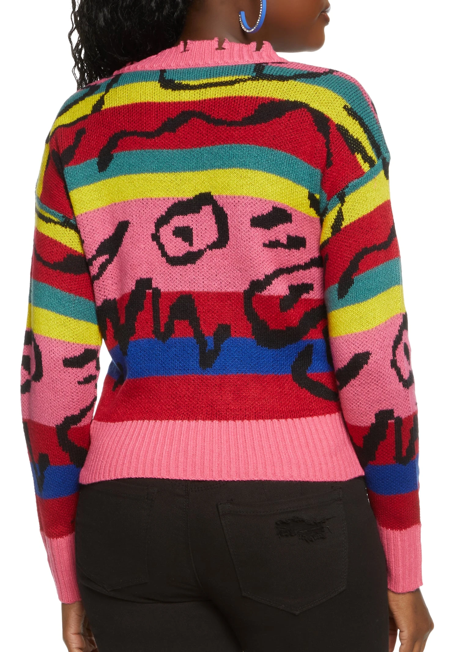 Striped Graffiti Print Frayed V Neck Sweater – PINK