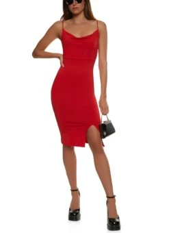 Solid Cowl Neck Front Slit Midi Dress