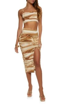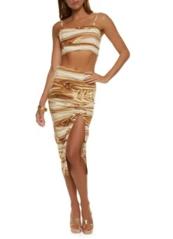 Swirl Print Ruched Side Slit Midi Skirt