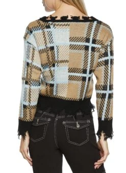 Cropped Plaid Patch Distressed Cardigan