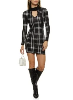 Plaid Mock Neck Keyhole Sweater Dress