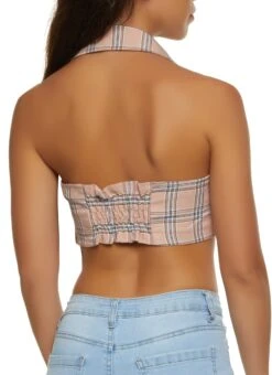 Plaid Open Back Button Front Halter Crop Top