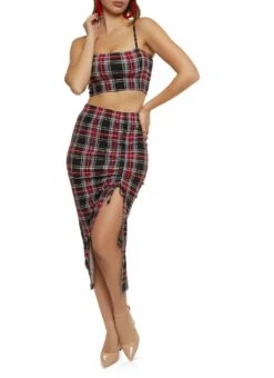 Plaid Ruched Side Slit Midi Skirt
